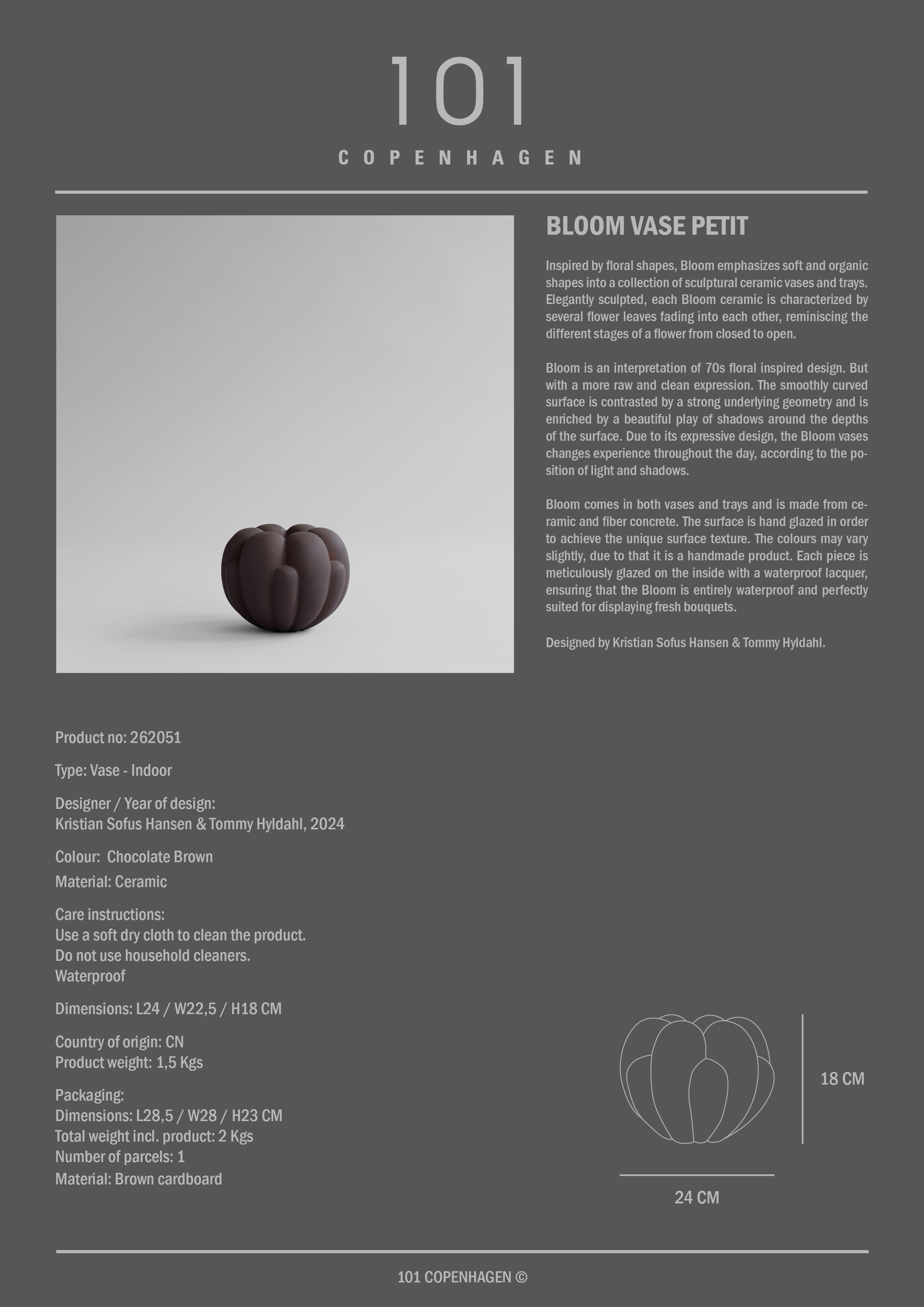 Inspireret af blomstens organiske former udfolder Bloom-kollektionen sig i en serie skulpturelle vaser og fade med bløde, flydende linjer. Hvert objekt er formgivet med lag af kronblade, der glider ind i hinanden og skaber en fornemmelse af bevægelse fra lukket knop til fuldt udspring. Kollektionen trækker tråde til 1970’ernes blomsterinspirerede design, men med et mere råt og afdæmpet udtryk, hvor den glatte overflade står i kontrast til en tydelig underliggende geometri. Lyset spiller hen over formens dybder og giver Bloom et levende udtryk, der ændrer karakter i takt med dagens skiftende lys og skygger.