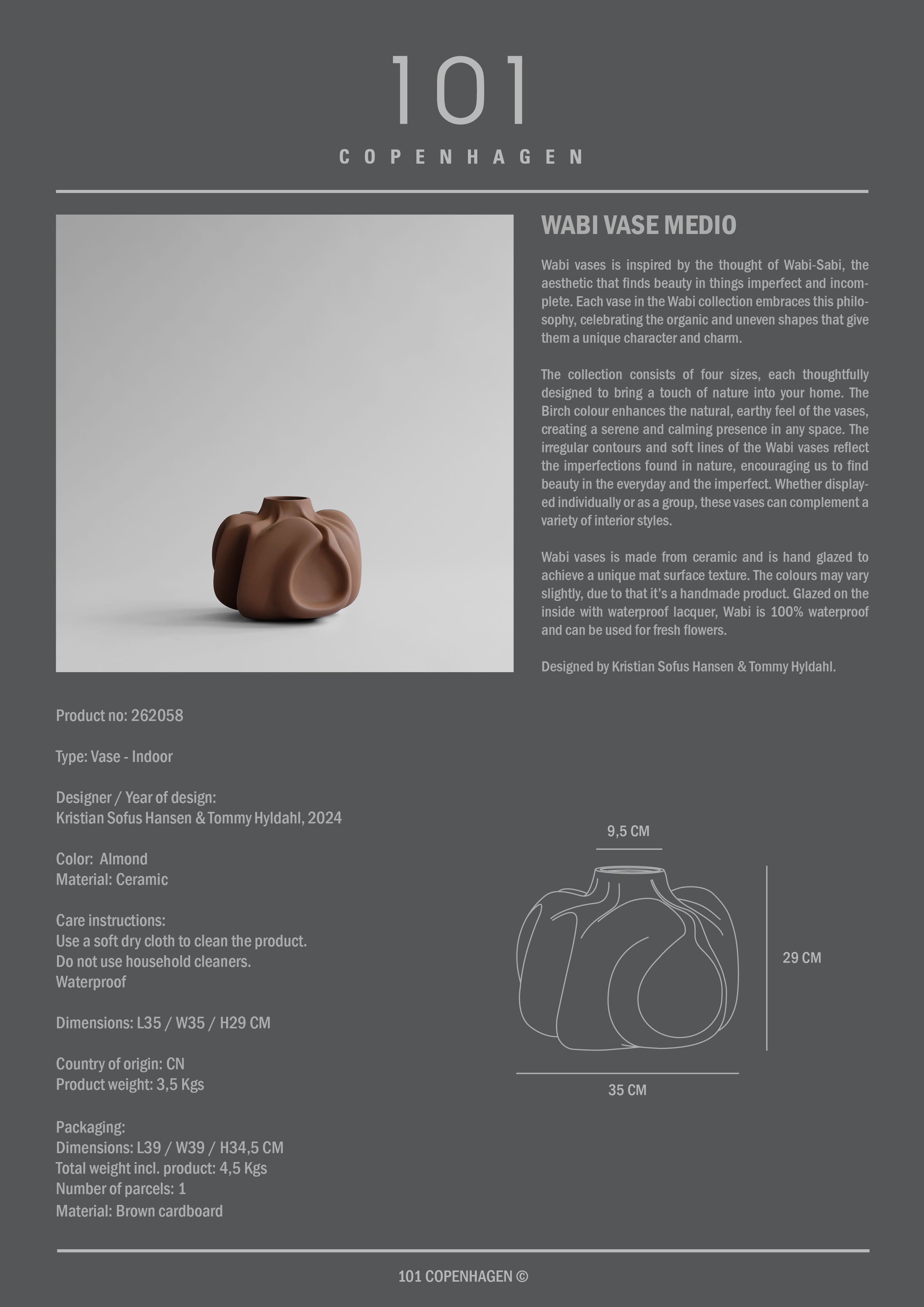 Wabi-serien udspringer af den japanske Wabi Sabi-filosofi, som finder skønhed i det uperfekte, det forgængelige og det ufærdige. Serien hylder materialernes naturlige variationer og de små uregelmæssigheder, der vidner om menneskelig hånd og tidens gang. Udført i både håndmalet keramik og mundblæst glas rummer kollektionen to forskellige, men beslægtede udtryk – det ene blødt og taktilt, det andet let og lysfyldt. Vaserne varierer i højde og proportioner og skaber tilsammen et harmonisk landskab, hvor forskellighed bliver en styrke, og hvor ro og nærvær står i centrum.