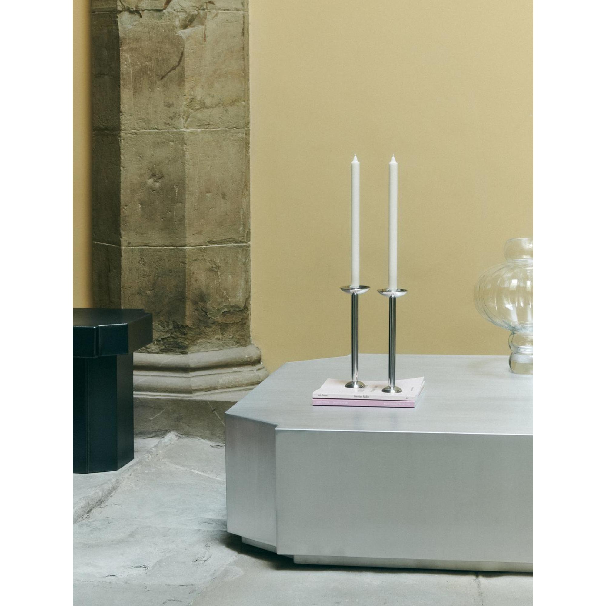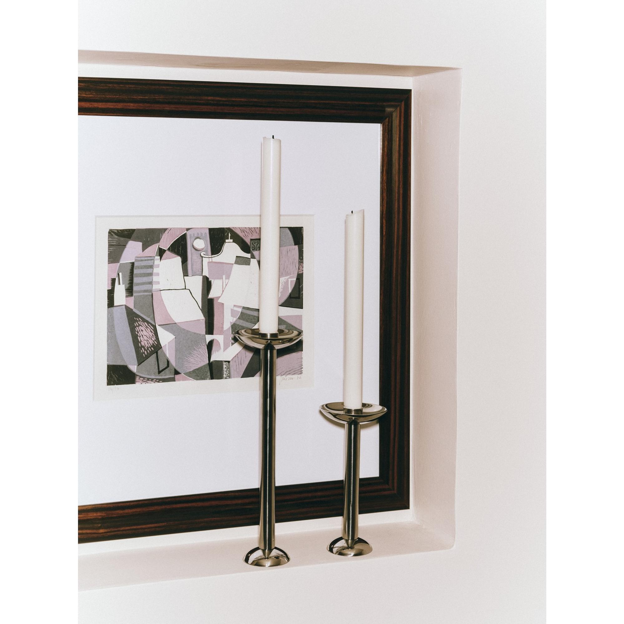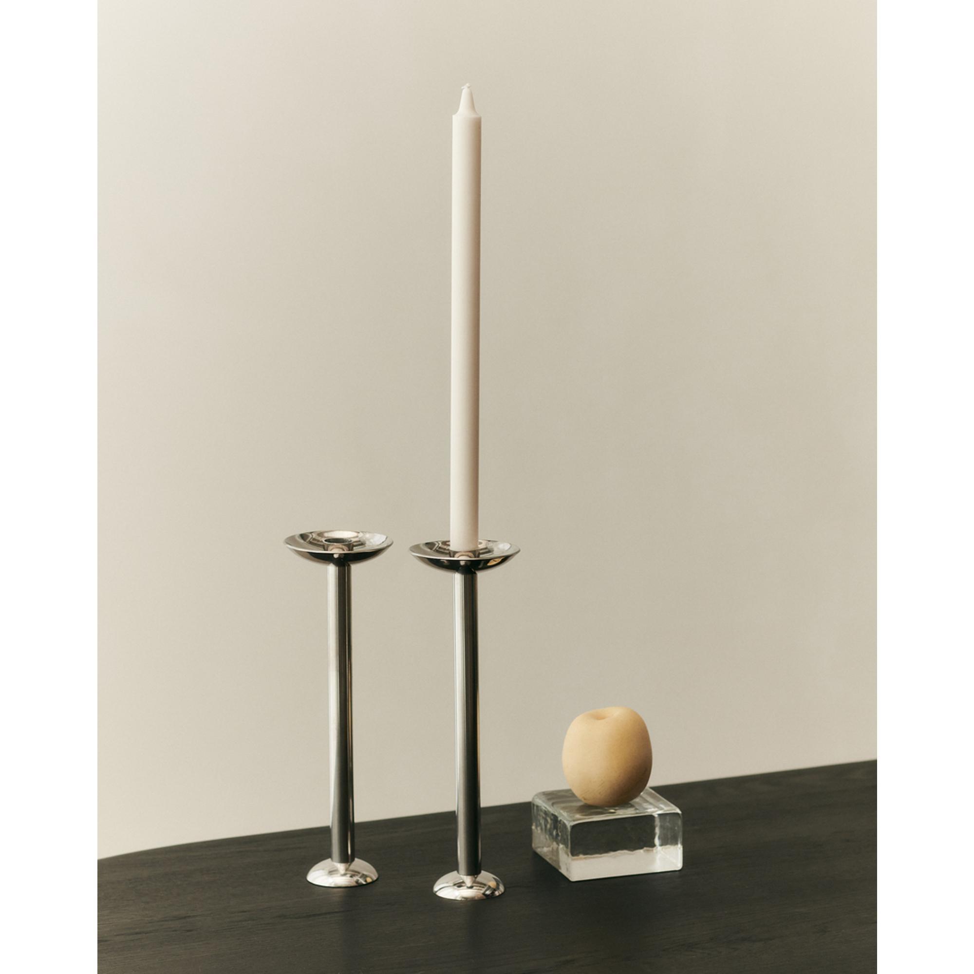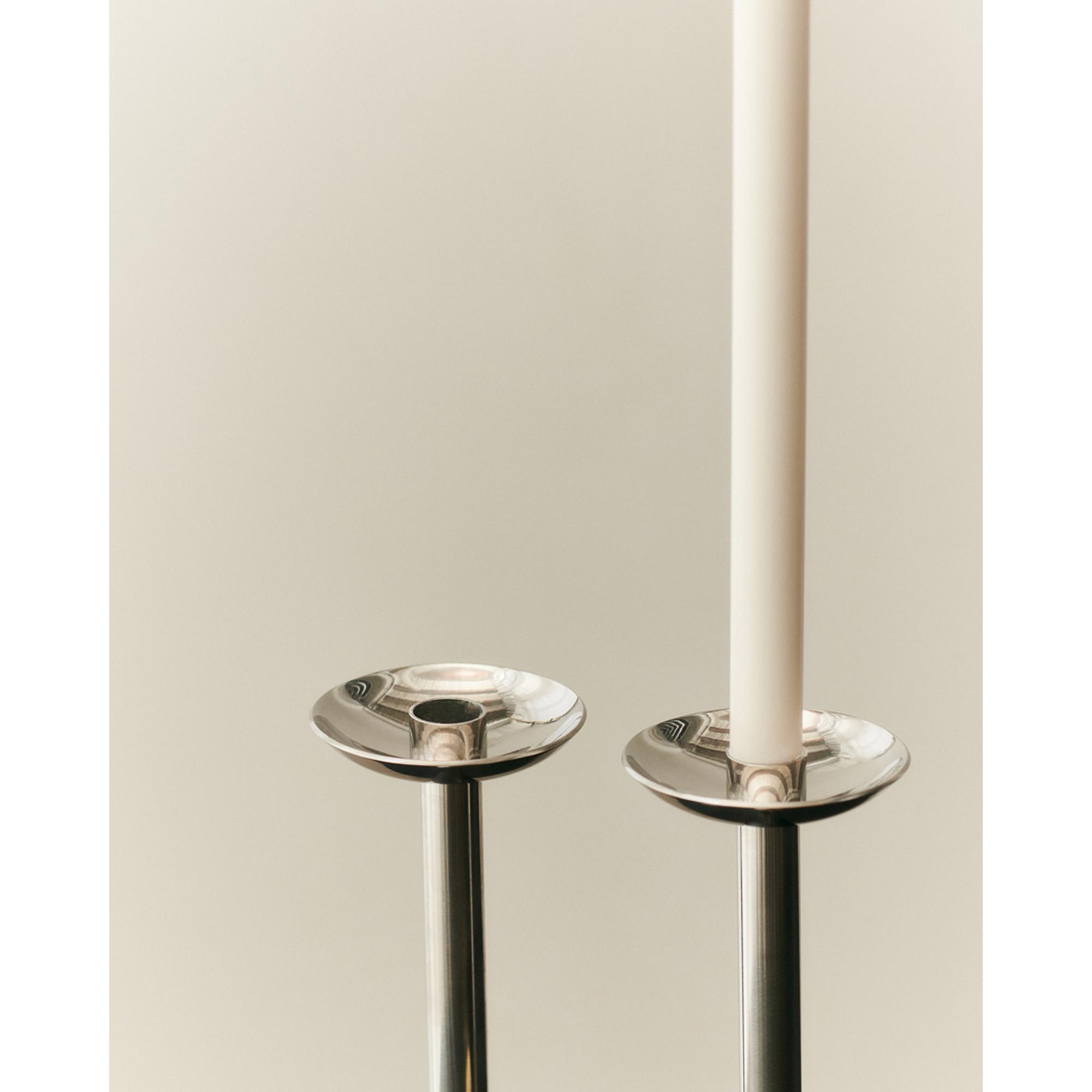 Den høje Champagne lysestage er et raffineret og arkitektonisk designobjekt, udført i massivt rustfrit stål, der fremstår både moderne og tidløst. Med sin slanke og vertikale profil skaber stagen en smuk kontrast til bløde tekstiler og naturlige materialer i rummet. Overfladen reflekterer lyset på elegant vis og tilfører et skarpt, grafisk element til enhver borddækning eller stilleben. Stagen er skabt med et blik for materialets styrke og renhed og fremstår som et skulpturelt statement i både moderne og klassiske hjem.