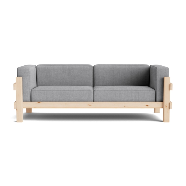 Kube Sofa forener kubistisk enkelhed med blød komfort i et udtryk, der balancerer midcentury-traditioner og moderne æstetik. Den markante ramme i massivt fyrretræ har et næsten brutalistisk præg, men blødes op af løst placerede puder på sæde, ryg og armlæn, som giver sofaen et afslappet og indbydende udtryk. Den åbne trækonstruktion fremhæver det håndværksmæssige niveau og de smukke samlinger, hvor de kraftige planker mødes i en nærmest skulpturel helhed. Træets naturlige struktur og tyngde bidrager med både holdbarhed og karakter og vil med tiden udvikle en smuk patina.